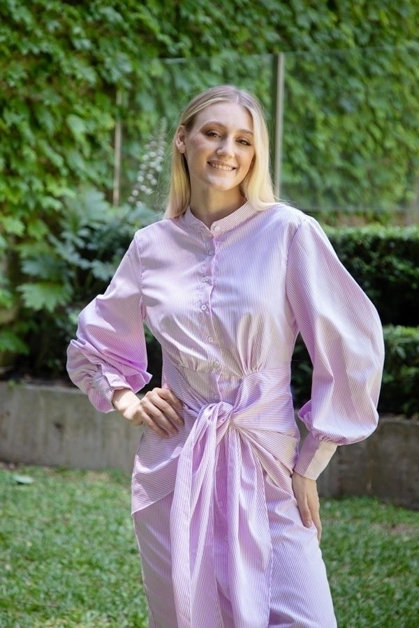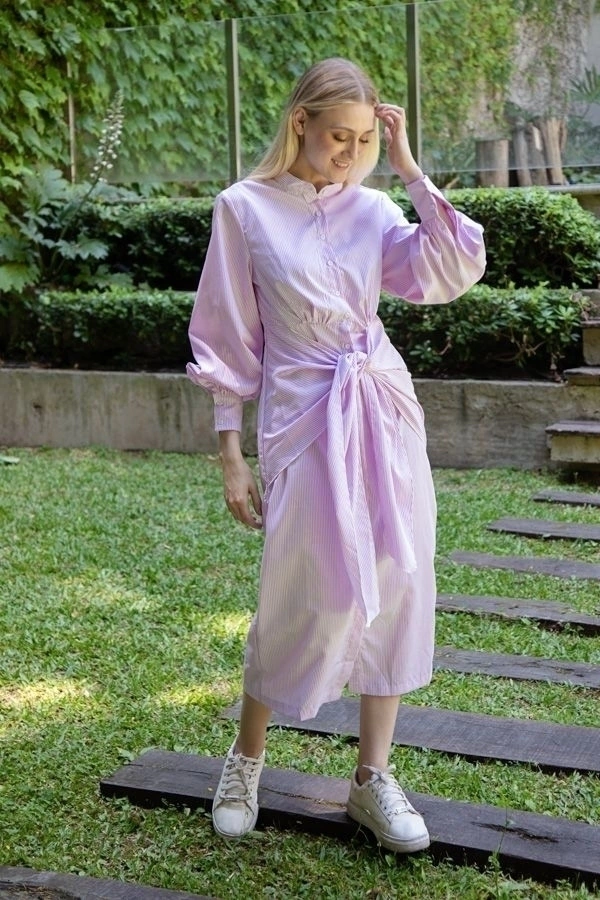 Vestido camisero rayado blanco con rosa, lazos en la cintura.